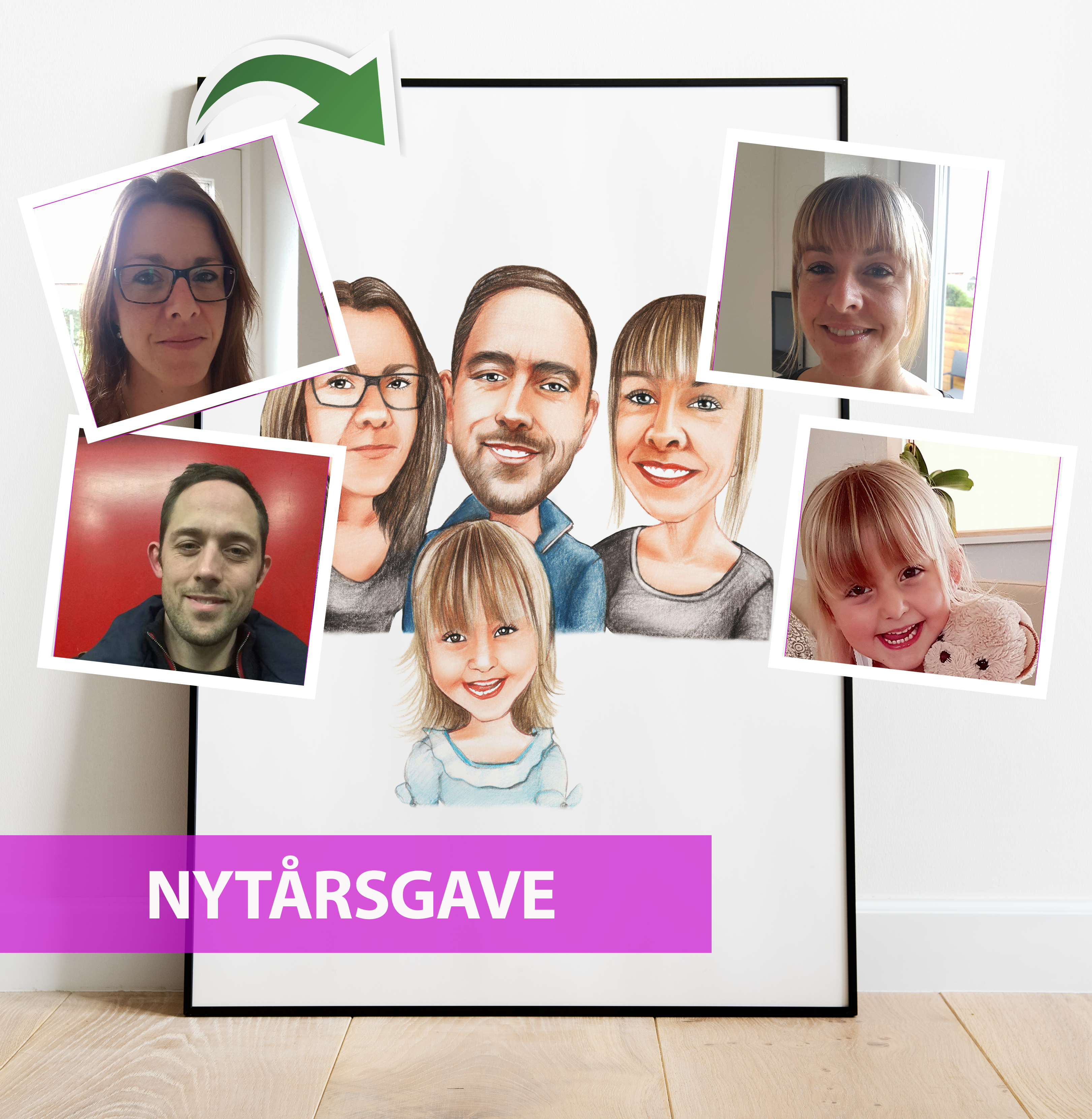 Giv dem karikaturerne som gave lige på slaget tolv. På den måde bliver det et nyt år, de aldrig vil glemme. Det er en håndtegnet karikatur tegnet efter et billede, du giver os.