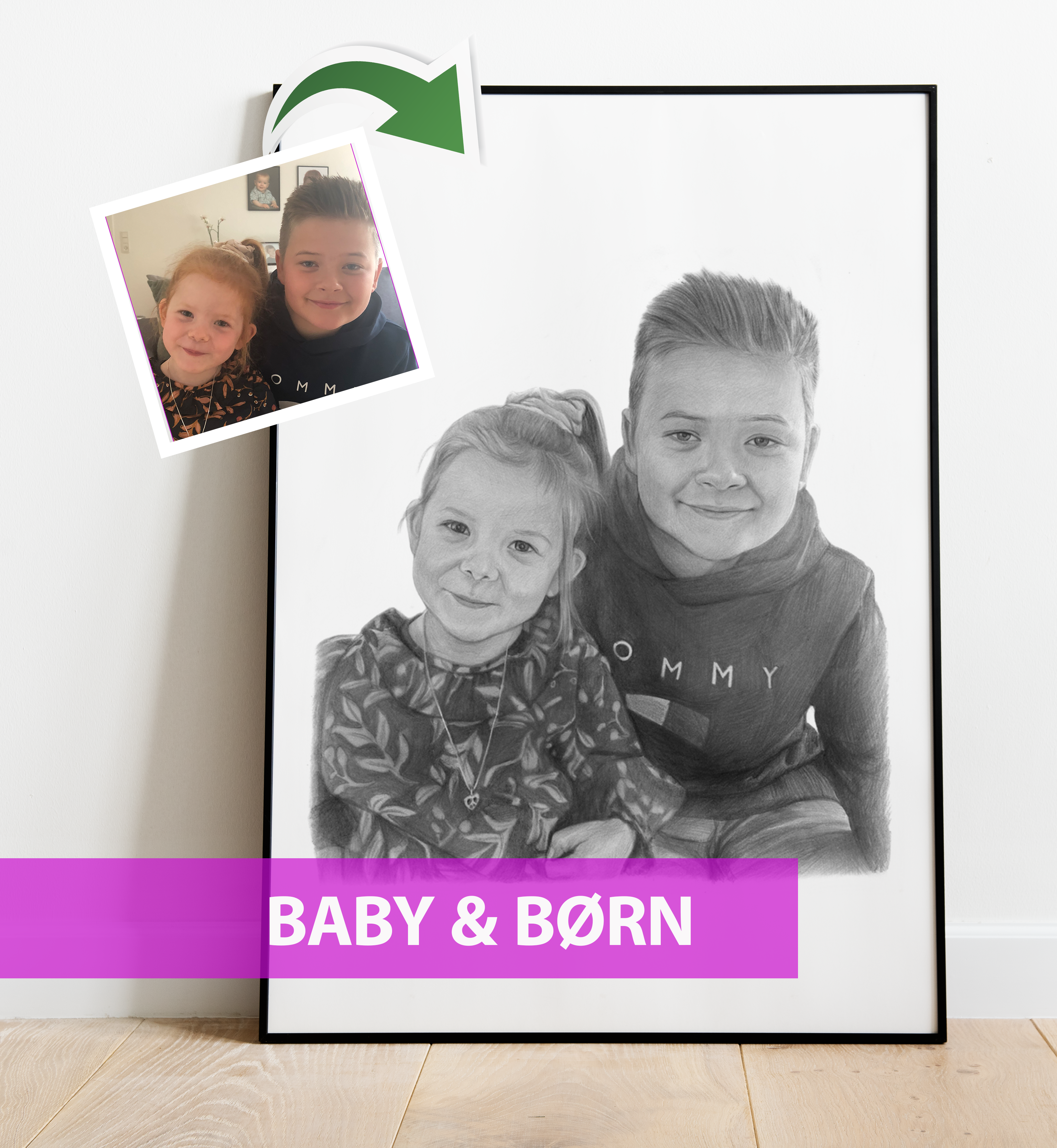 Bestil en personlig håndtegnet portrættegning af baby & børn. Det vil være den perfekte gave til dig selv eller en du holder af.