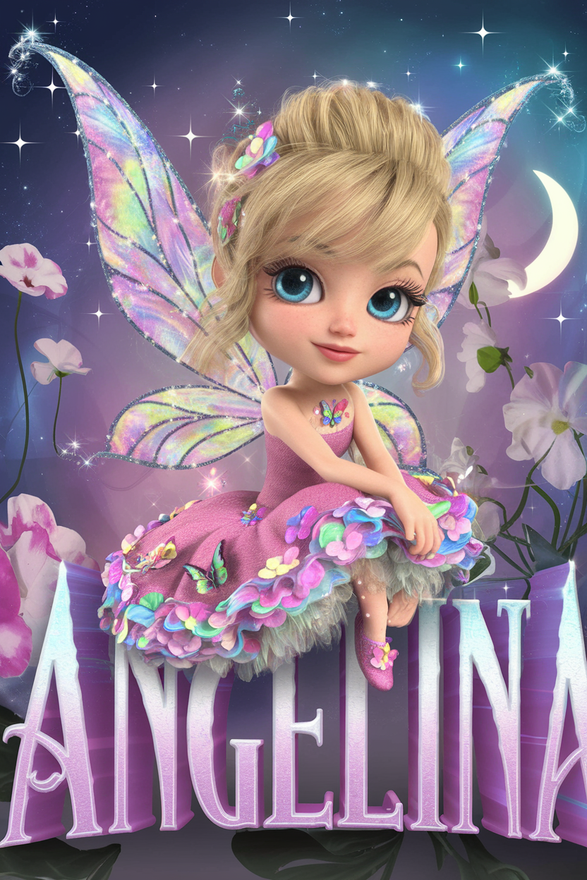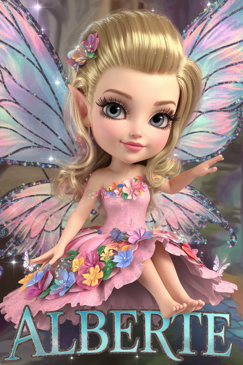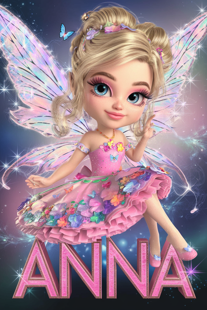 Denne plakat er en 3D-rendering af en yndig chibi-fe med smukt, bølgende blondt hår, strålende blå øjne og en sart hudtone. Klædt i en sød, lyserød kjole med farverige blomster og glitrende sommerfugle-detaljer sidder feen elegant på det fremhævede navn – her "Agnete" – som er skrevet i en livlig og stilfuld skrifttype. Feens vinger glitrer i iriserende toner, og baggrunden er fyldt med en magisk lysende atmosfære, der skaber et vidunderligt eventyrunivers.