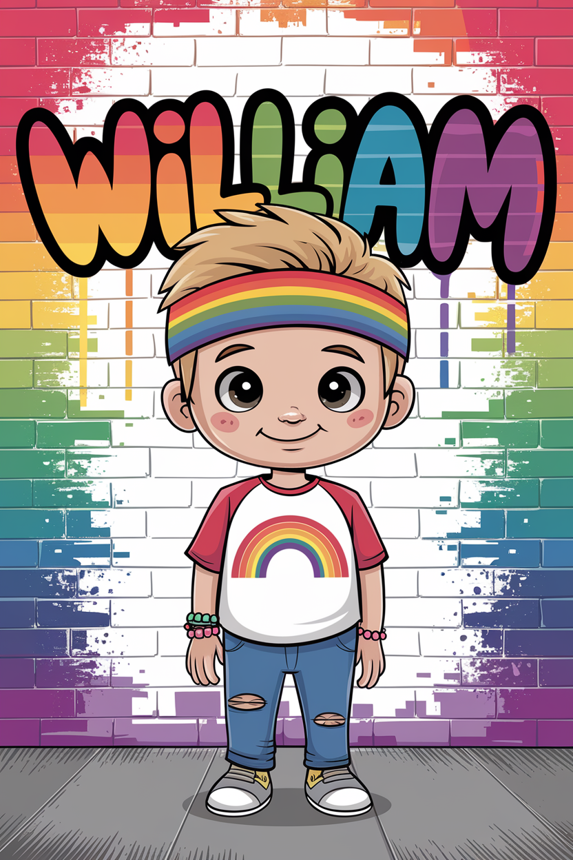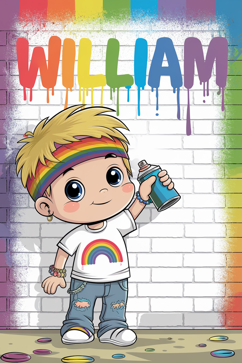 Skab liv og kreativitet i dit hjem med denne unikke plakat af en sød graffiti-pige/dreng! Motivet viser en smilende, tegneseriestil pige/dreng iført en farverig pandebånd og hvid T-shirt med regnbuedesign. Hun holder en spraydåse og står foran en hvid murstensvæg, hvor teksten af navnet er malet som graffiti i flotte regnbuefarver. Plakaten er perfekt til at tilføje et strejf af street art-stil og personlighed til ethvert rum.